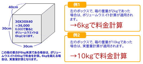 たてcm×横cm×高さcm÷6000=ボリュームウエイトKGとなります。